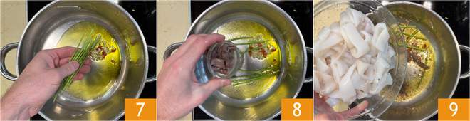 Añade también los tallos de perejil 7, las anchoas 8, previamente desaladas, y deja que se disuelvan a fuego lento. En este punto, añade los calamares 9 y déjalos dorar durante unos 5 minutos, hasta que toda el agua que liberan durante la cocción se evapore.