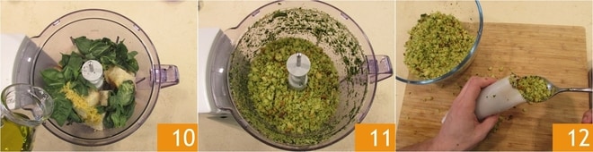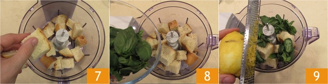 Ahora podéis pasar a la preparación del relleno: cortad el pan en cubitos y ponedlo en un procesador de alimentos con cuchillas de acero 7, luego salpimentad y añadid las hojas de albahaca, que habréis lavado y secado previamente 8. Agregad también la ralladura de limón y el zumo 9.
