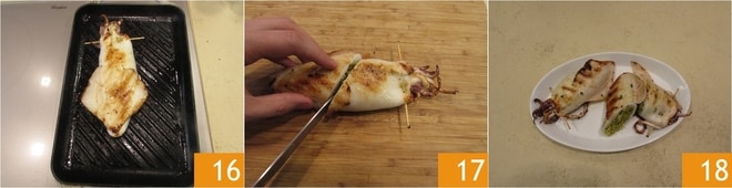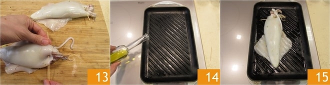 En este punto, retomad el grupo de tentáculos que habíais removido anteriormente, colocadlo en el extremo del calamar y sellad la apertura con un palillo, insertando tanto los bordes del calamar como el grupo de tentáculos con el palillo; de esta manera fijaréis el grupo de tentáculos al cuerpo del calamar e impediréis que el relleno se salga 13. Calentad bien una parrilla y untadla con aceite 14, luego colocad los calamares rellenos de un lado y dejadlos cocinar durante unos 10-12 minutos a fuego medio 15.