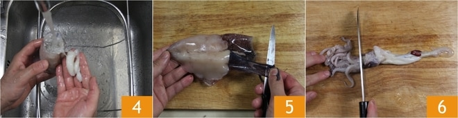 Extraed las vísceras con las manos, lavando cuidadosamente el interior del cuerpo bajo agua corriente 4. Retirad la piel del calamar con las manos 5; finalmente, retomad el grupo de tentáculos y eliminad el ojo cortándolo con un cuchillo 6. Necesitaréis aproximadamente 600 g de calamares limpios. Para más información sobre la limpieza de los calamares, podéis consultar nuestra escuela de cocina "Cómo limpiar los calamares".