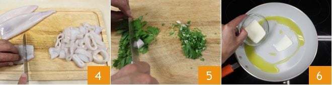 Ahora que vuestros calamares están limpios, cortadlos en anillos de aproximadamente un centímetro 4. Picad juntos la chalota, el ajo y el perejil 5. Poned a calentar el aceite y la mantequilla en una cacerola 6,
