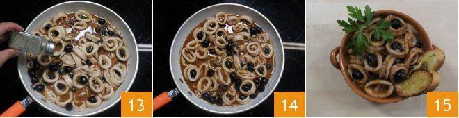 y pimienta 13 para terminar la preparación. Vuestros calamares con aceitunas están listos 14, servidlos acompañándolos con unas rebanadas de pan tostado y disfrutadlos bien calientes 15.