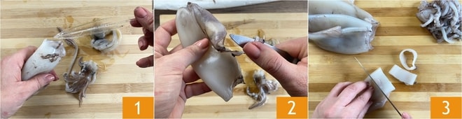 Para preparar los calamares con guisantes, primero limpia los calamares: enjuágalos bajo agua, separa la cabeza del manto y extrae con cuidado las vísceras y la pluma de cartílago que se encuentra en el interior 1. Enjuágalos bien, por dentro y por fuera, y retira la piel 2, incluido el pico. Enjuágalos varias veces y finalmente córtalos en rodajas de aproximadamente 2 cm de ancho 3.