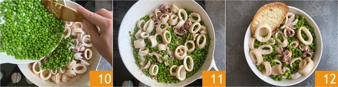 En este punto añade los guisantes 10, añade un hilo de aceite y cocina durante otros 10 minutos 11. Ajusta de sal, si es necesario, y sirve tus calamares con guisantes acompañados de unas rebanadas de pan tostado 12!