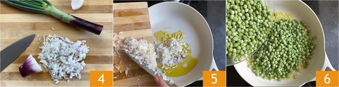 Limpia y pica finamente el cebollino 4. Calienta un poco de aceite en una sartén, añade el cebollino 5 y déjalo pochar, luego añade los guisantes 6, sala y cocina durante unos 10 minutos a fuego medio-bajo.