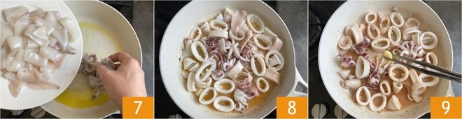 Mientras tanto, vierte los calamares en otra sartén con otro poco de aceite y el diente de ajo 7. Desglasa con el vino blanco y cocina durante unos 10 minutos siempre a fuego medio-bajo 8, luego retira el ajo de la sartén 9.