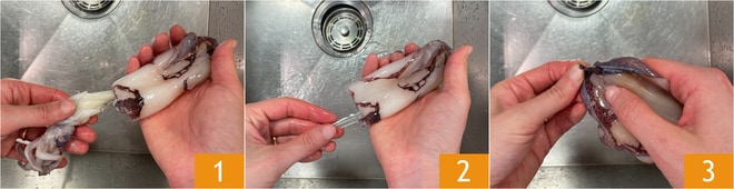 Para preparar los calamares gratinados al horno con tomatitos y aceitunas, lo primero que debéis hacer es dedicaros a la Cómo limpiar los calamares: separad los tentáculos del manto 1 y extraed la pluma de cartílago que se encuentra en su interior 2. Enjuagad bajo agua corriente y ayudad a eliminar las vísceras que se encuentran en el manto con las manos. Haced una incisión con un cuchillo en la parte final del manto y eliminad la piel externa 3.
