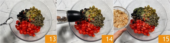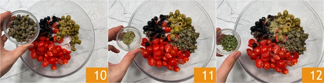 Añadid también las alcaparras desaladas 10, el orégano seco 11 y el cebollino seco 12.