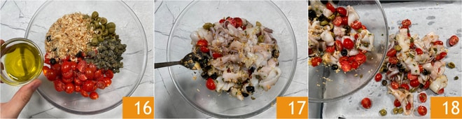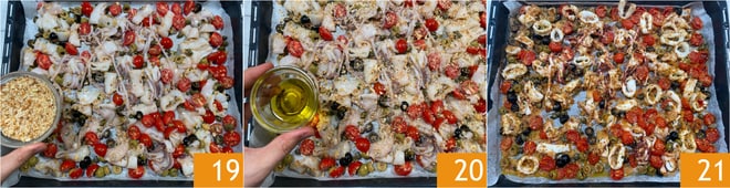 En este punto, espolvoread con el pan rallado restante 19 y los 10 g restantes de aceite 20. Cocinad en horno estático a 200° durante 10 minutos, luego pasad al modo ventilado, siempre a 200°, durante otros 15 minutos. ¡Vuestros calamares gratinados al horno con tomatitos y aceitunas están listos para ser servidos 21!