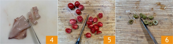 Cortad el manto en anillas de unos 2 cm de grosor 4. Finalmente, separad el ojo de los tentáculos y colocadlos en un bol junto con los aros de calamar. Ahora dividid por la mitad los tomatitos 5 y las aceitunas verdes 6.