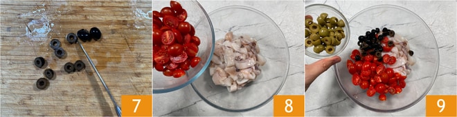 Haced lo mismo con las aceitunas negras 7. Agregad los tomatitos al bol con los calamares 8, junto con las aceitunas negras y verdes 9.