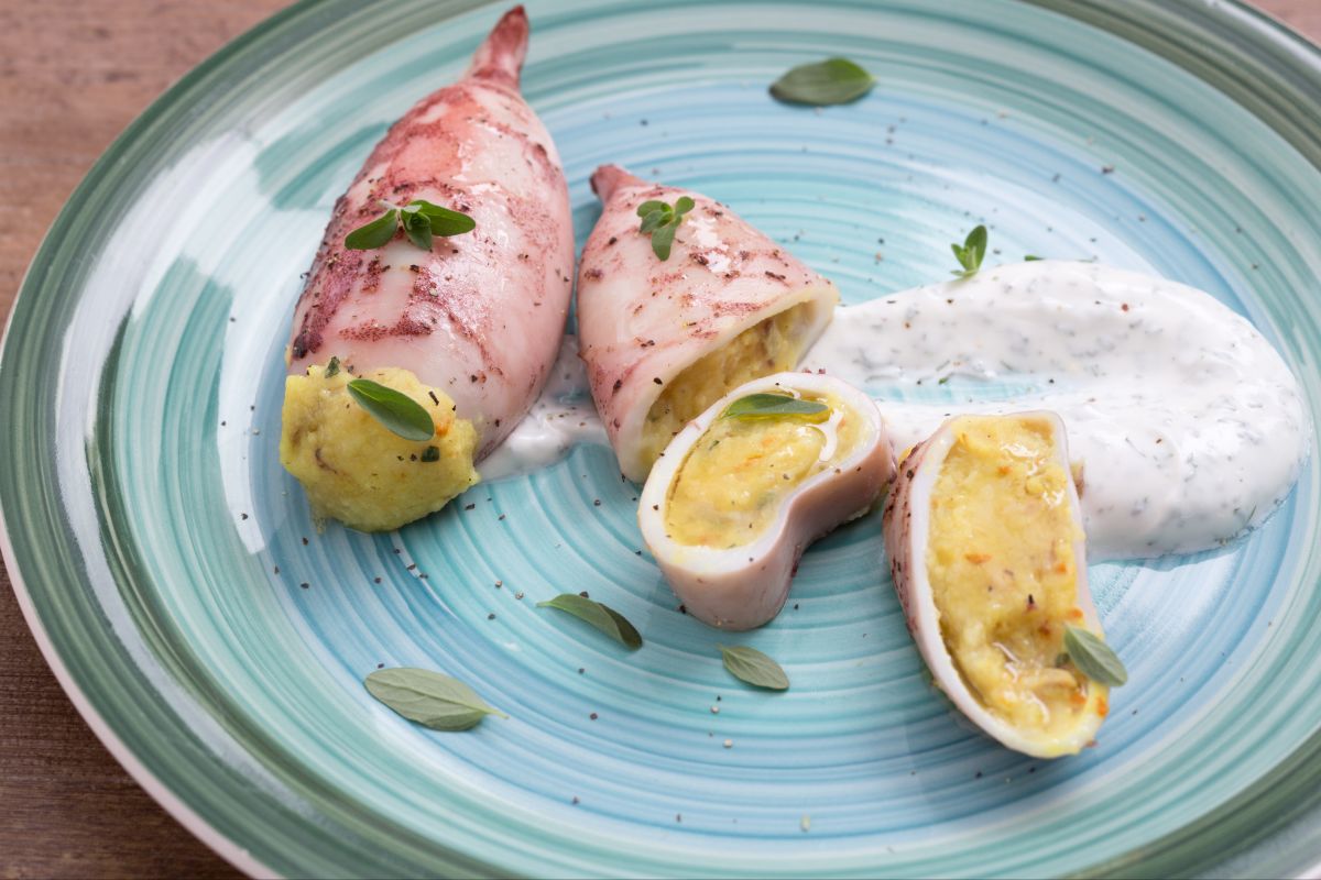 Los calamares, primos menos apreciados de los chipirones. A menudo se confunden las dos especies, pero nosotros conocemos bien la diferencia: la forma, el color... aunque para usarlos pueden ser intercambiables. Así como os deleitamos con los Calamares rellenos hemos querido rellenar también a sus primos del mar: calamares rellenos al horno, la receta de hoy. Un relleno sustancioso y suave de patatas, pan remojado y cúrcuma fresca hará que los calamares sean muy apetitosos. Una nube de frescura para acompañarlos: una crema de yogur que dará a este segundo plato de pescado un toque extra.