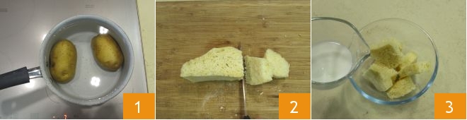 Para preparar los calamares rellenos, empieza con las patatas: colócalas en una cacerola con agua fría y cuenta unos 20-30 minutos desde que empiece a hervir (puedes acelerar la cocción con la olla a presión) 1. Una vez listas (verifica que se puedan pinchar fácilmente con un tenedor), déjalas enfriar un poco, luego pélalas y resérvalas. Procede quitando la corteza del pan; haz trozos la miga 2 y remójala con la leche 3.