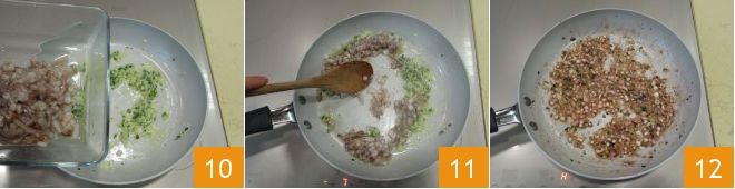A continuación, añade el picado de aletas y tentáculos 10 y cocina a fuego alto por unos instantes 11, asegurándote de que el agua liberada por los calamares se evapore por completo 12.