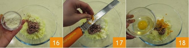 el Parmesano rallado 16, la cúrcuma fresca pelada rallándola directamente en el bol 17, la sal, la pimienta y el huevo entero 18.