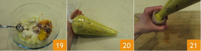 Mezcla bien todo 19 y, una vez integrados todos los ingredientes, transfiere la mezcla obtenida a una manga pastelera desechable 20. Precalienta el horno a 180° en modo estático, luego unta con aceite el fondo de una pequeña bandeja de horno (deberá contener 4 calamares rellenos), rellena los calamares con el relleno hasta el borde 21