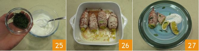 y el eneldo 25, luego mezcla bien. Una vez cocinados los calamares, sácalos del horno 26 y emplata sirviendo cada calamar relleno al horno con la salsa de acompañamiento 27.