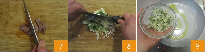 Pica las aletas 7 y los tentáculos de los calamares; luego pica finamente también la cebolleta, previamente privada de la parte verde y de la barba, junto con las hojitas de mejorana 8. En una sartén calienta el aceite de oliva virgen extra, añade el picado de cebolleta y mejorana 9 y sofríe a fuego lento removiendo de vez en cuando durante unos minutos.