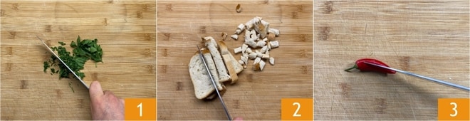 Para preparar los calamares rellenos en sartén, pica el perejil 1 y corta en cubos pequeños el pan (te servirá para el relleno posterior) 2. Haz un corte longitudinal al guindilla 3.