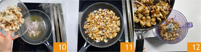 Añade también el pan mezclando a menudo 10 para dar sabor 11. Vierte la mezcla en la batidora 12.