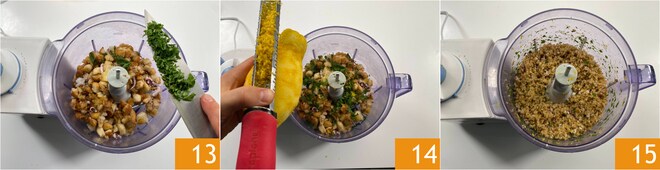 Aromatiza con el perejil 13, la sal y la ralladura de limón 14, tritura todo para obtener migas 15.