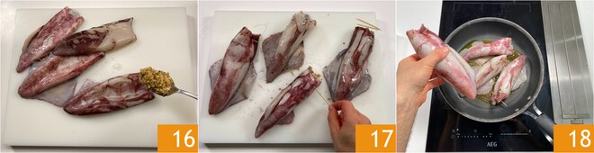 Rellena los calamares dejando aproximadamente 2 cm desde el borde 16 y sella con un palillo para que no se salga el relleno durante la cocción 17. En la sartén calienta un poco de aceite y dora los calamares a fuego alto 18 tratando de girarlos por todos lados, ayúdate con unas pinzas.