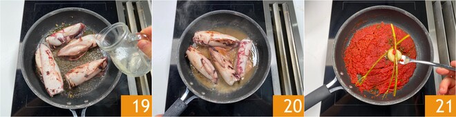 Vierte el vino blanco 19 y deja que se evapore 20. Mientras tanto, la salsa estará lista, elimina el ajo, el guindilla y los tallos de perejil 21.