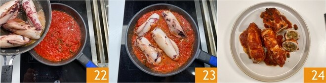 Transfiere los calamares a la salsa 22. Deja que tomen sabor justo 1-2 minutos 23 y sirve bien calientes los calamares rellenos en sartén 24.