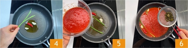 En una sartén calienta un poco de aceite con el ajo, el guindilla cortado y los tallos de perejil 4. Añade los tomates pelados 5, las alcaparras (previamente desaladas) 6 y deja cocinar 40 minutos a fuego bajo; ajusta de sal durante la cocción.