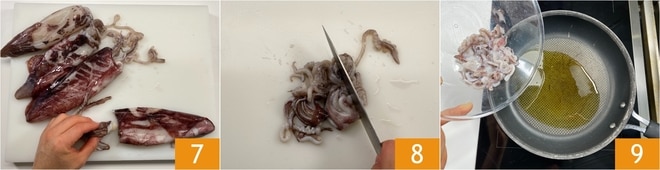 Mientras tanto, limpia los calamares: elimina el interior 7 y los ojos de los tentáculos. Mantén la piel y las aletas, mientras que corta groseramente los tentáculos 8. En una sartén calienta un poco de aceite y sofríe a fuego muy alto los tentáculos 9.