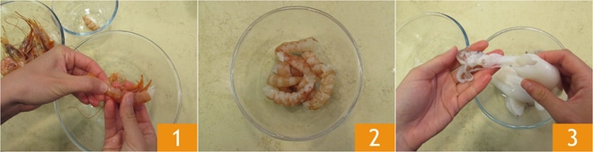 Para preparar los calamares y gambas gratinados con verduras, comienza limpiando las gambas: quita la cabeza 1, retira todo el caparazón y elimina el intestino (si prefieres puedes ayudarte con un palillo de madera) y luego reserva las gambas 2. Ahora ocupaos de la limpieza de los calamares: quita el tentáculo y limpia bien el interior del calamar 3, enjuagándolo con agua corriente.