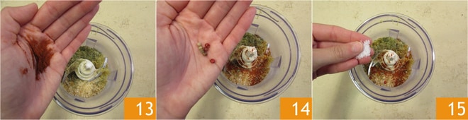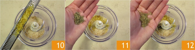 Tritura el pan hasta obtener la consistencia del pan rallado y añade la cáscara de limón 10, mejorana, tomillo 11, orégano 12.