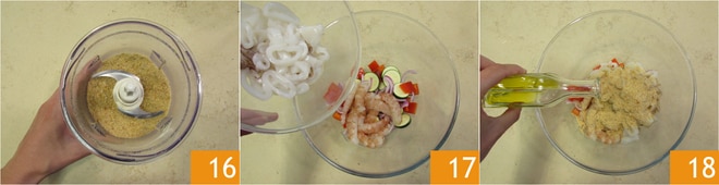 Tritura bien para sazonar 16. Vierte en un bol las gambas, los calamares, las verduras 17 y el empanado, condimenta con un chorrito de aceite 18.