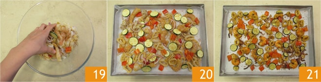Mezcla bien 19 y extiende sobre una bandeja con papel de horno 20, sin amontonar los ingredientes, de lo contrario, les costará gratinarse. Hornea en horno estático precalentado a 200 grados durante 15 minutos. Pasado este tiempo, dales otros 15 minutos subiendo la temperatura a 230 grados. Cuando todos los ingredientes estén bien gratinados, tu bandeja estará lista. Sirve los calamares y gambas gratinados con verduras recién sacados del horno 21.