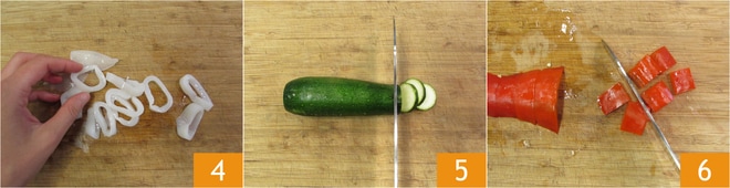 Corta los calamares en anillos de aproximadamente 8 mm de grosor 4, mientras que el tentáculo déjalo entero. Ahora corta las verduras: lava, recorta el calabacín y córtalo en rodajas de aproximadamente 5 mm 5. Lava el pimiento, vacíalo de semillas y filamentos interiores y córtalo en cuadraditos de aproximadamente 2 cm 6.