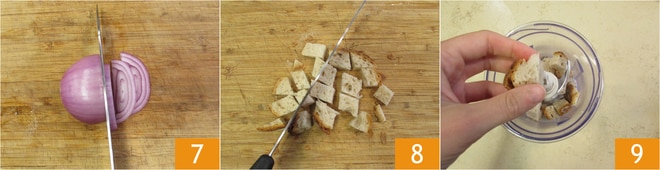 Pela y corta la cebolla en rodajas de aproximadamente 5 mm de grosor 7. Ahora preparamos el pan rallado a partir de una rebanada de pan seco que cortarás en trozos grandes 8 y pondrás en un procesador de alimentos 9.