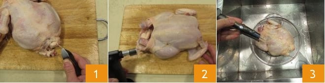 Para preparar el caldo de gallina (o pollo), comenzad eliminando posibles plumas que hayan quedado pegadas 1 y flamead las demás 2 para eliminarlas definitivamente (podéis usar un soplete o pasar el pollo por la llama del gas). Después, enjuagad cuidadosamente y secad con papel de cocina 3, luego reservad.