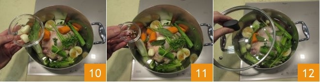 Añadid también el perejil, el ajo y el laurel 10 y la pimienta en grano 11, finalmente verted el agua y cubrid con una tapa, dejando cocinar a fuego lento durante 50 minutos 12. Es preferible durante la cocción retirar la espuma del caldo para eliminar impurezas y exceso de grasa.