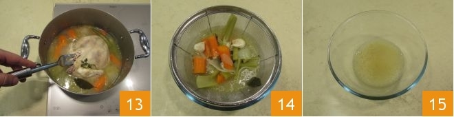 El caldo de gallina, o pollo, en este punto estará listo 13, ajustad de sal y dejad enfriar en la olla. En este momento podréis reservar la carne y escurrir las verduras 14 y filtrar el caldo para usarlo en vuestras preparaciones 15. Si en cambio queréis cocinar la pasta, bastará con volver a hervir el caldo y luego cocerla.