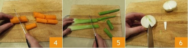 Ahora dedicad vuestro tiempo a limpiar las verduras, pelad las zanahorias y cortadlas en trozos 4. Quitad los extremos de los tallos de apio y cortadlos también 5 y finalmente ocupáos de la cebolla, pelándola y cortándola por la mitad, luego eliminad la parte central 6.
