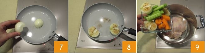 Para realzar el sabor de la cebolla, colocadla en una sartén antiadherente 7 y dejadla tostar a fuego alto durante 4 minutos, girándola de vez en cuando 8. En este punto ya estáis listos para la cocción del caldo. En una cacerola grande, poned la gallina, o el pollo, y añadid el apio, la zanahoria y la cebolla tostada 9.
