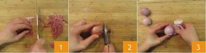 Comenzad a preparar el caldo de jamón. Tomad las lonchas de jamón un poco gruesas y colocadlas una encima de otra. Luego, usando un cuchillo afilado, cortadlas en juliana 1. Continuad así hasta terminar el jamón. Deberéis obtener un corte regular que permitirá obtener un dorado uniforme y dará más sabor al caldo. Reservad el jamón y ocupáos de los chalotes. Primero, peladlos (2-3),