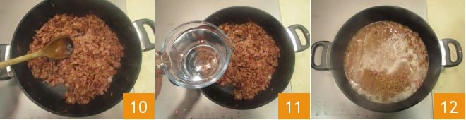 y removiendo constantemente, dejadlos brasear juntos. Cuando hayáis obtenido un dorado uniforme 10, podéis añadir el agua fría 11. Subid el fuego y al principio optad por un hervor a fuego muy alto 12 que ayuda a liberar las impurezas. Luego, bajad el fuego y continuad la cocción durante otros 45 minutos. En este caso, el hervor lento sirve para obtener un caldo más claro y más limpio.
