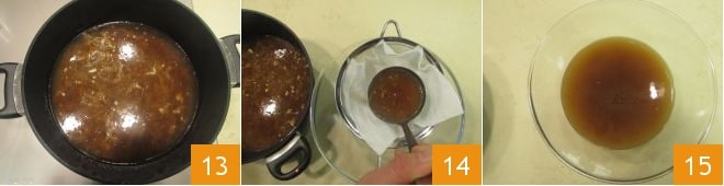 Pasado el tiempo necesario 13, colocad un papel alimentario de trama fina sobre un colador. Alternativamente, podéis utilizar una gasa de uso alimentario. Usando un cucharón, retirad solo la parte líquida, reservando el jamón y el chalote que servirán posteriormente, y vertedla en el colador 14 para filtrarla. Tan pronto como obtengáis todo el caldo 15, guardadlo en el frigorífico durante las siguientes 24 horas y mientras tanto preparad el polvo de jamón.