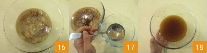 Transcurridas las 24 horas, retomad el caldo. Podréis notar que la parte líquida oscura habrá quedado abajo, mientras que la grasa habrá subido a la superficie 16. Usando un cucharón, eliminad entonces la parte grasa 17, hasta obtener un caldo claro, completamente desgrasado 18.