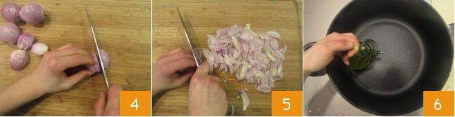 luego cortadlos primero por la mitad 4 y después en rodajas finas regulares a lo largo 5. En este punto, calentad una cazuela, añadid un chorrito de aceite que servirá para dar un poco de grasa 6.