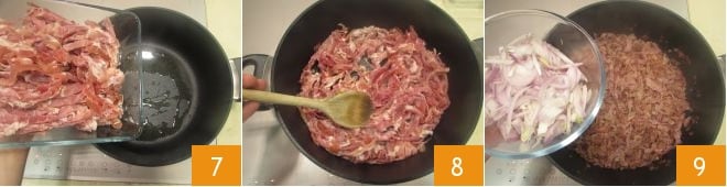 Cuando el aceite esté bien caliente, añadid el jamón 7 y dejadlo dorar removiendo a menudo 8, hasta que al probarlo esté bien crujiente. Esta fase es muy importante porque extrae el sabor del jamón y también la salinidad; de hecho, no será necesario añadir sal al caldo. Cuando el jamón esté bien tostado, añadid también los chalotes 9