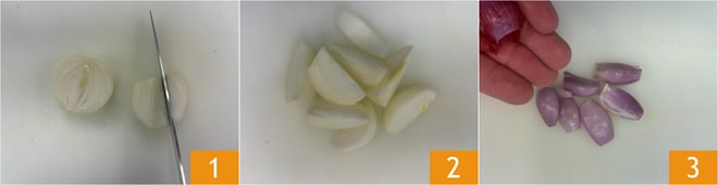 Para preparar el caldo de verduras en microondas, lo primero que hay que hacer es dedicarse a la limpieza de las verduras. Limpia una cebolla dorada, divídela por la mitad 1 y luego córtala en gajos 2. Limpia una chalota y obtén gajos 3.