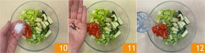Pon todas las verduras en un bol de pyrex, añade la sal gruesa 10 y la pimienta en grano 11. Cubre con agua fría 12 y cocina en microondas a 650 W durante 25 minutos.