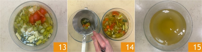 Una vez cocido 13 filtra las verduras con un colador 14. El caldo de verduras en microondas está listo 15 para ser utilizado en tus recetas.